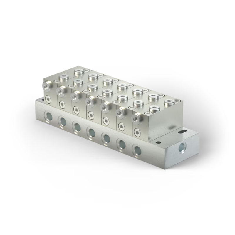 PSG2 состоит из опорной панели и набора дозирующих сегментов, которые можно комбинировать для достижения необходимых соотношений выходов. Каналы, по которым проходит масло, интегрированы в опорную панель, что упрощает обслуживание и замену сегментов. Такая конструкция позволяет легко адаптировать систему смазывания к изменяющимся требованиям производства.